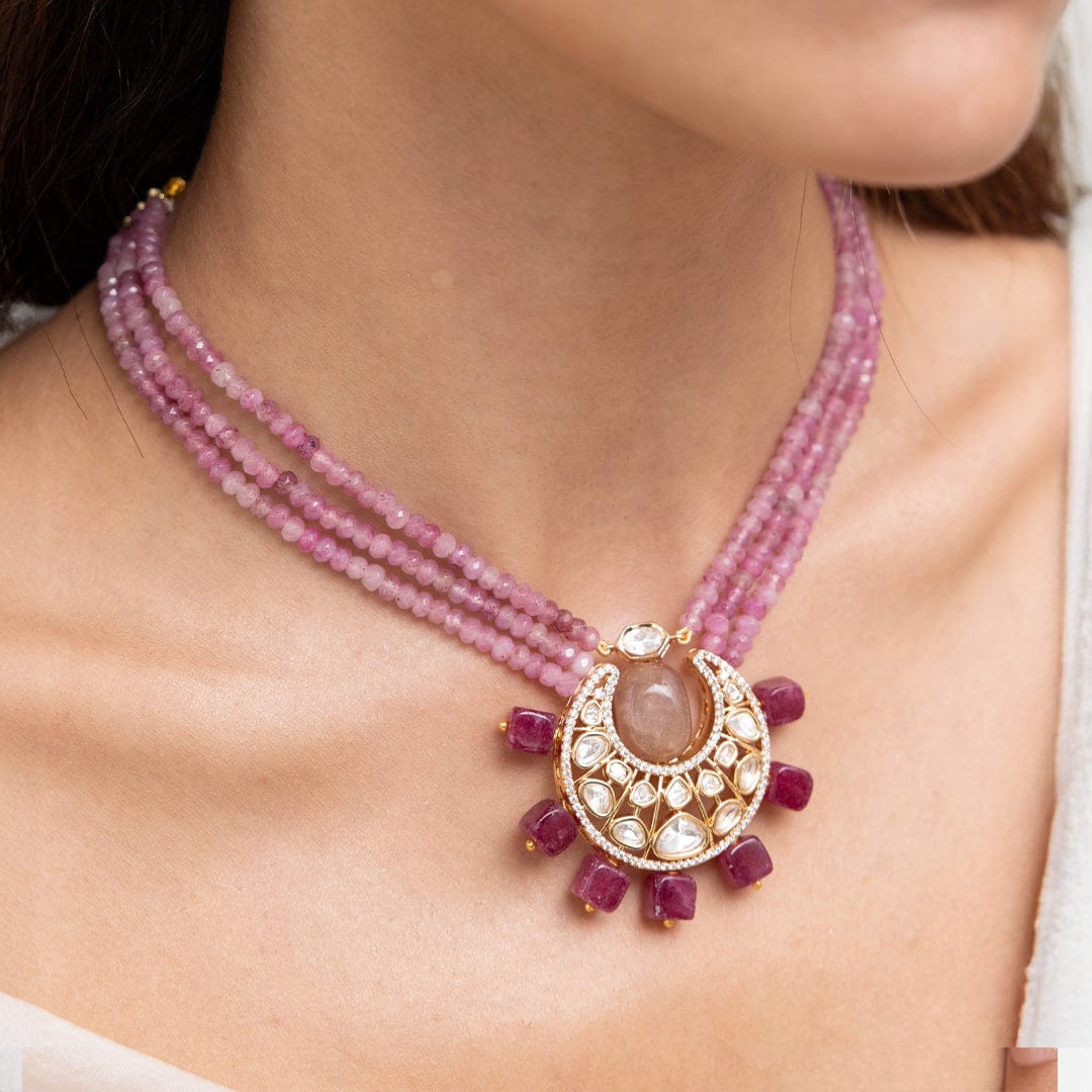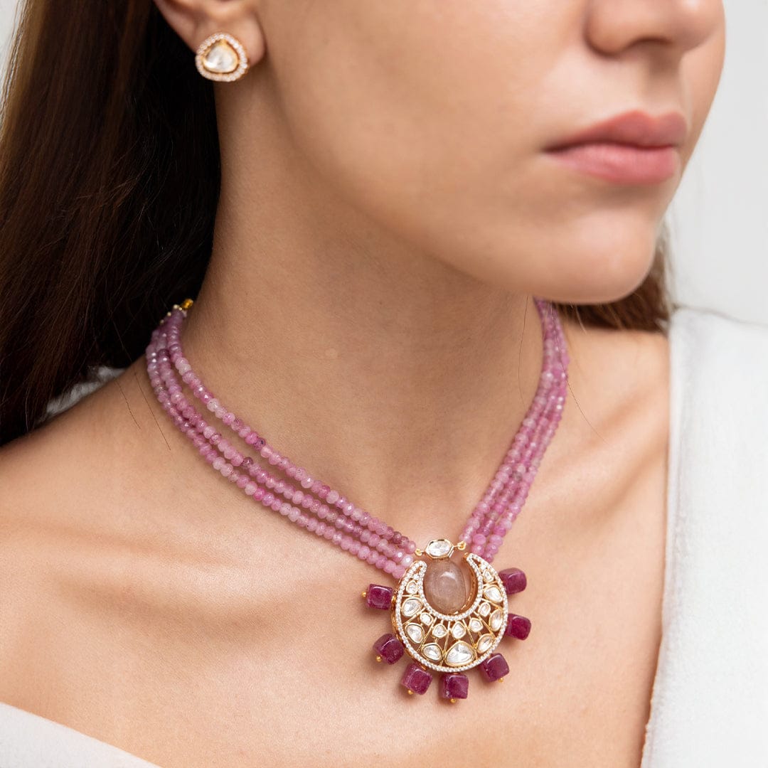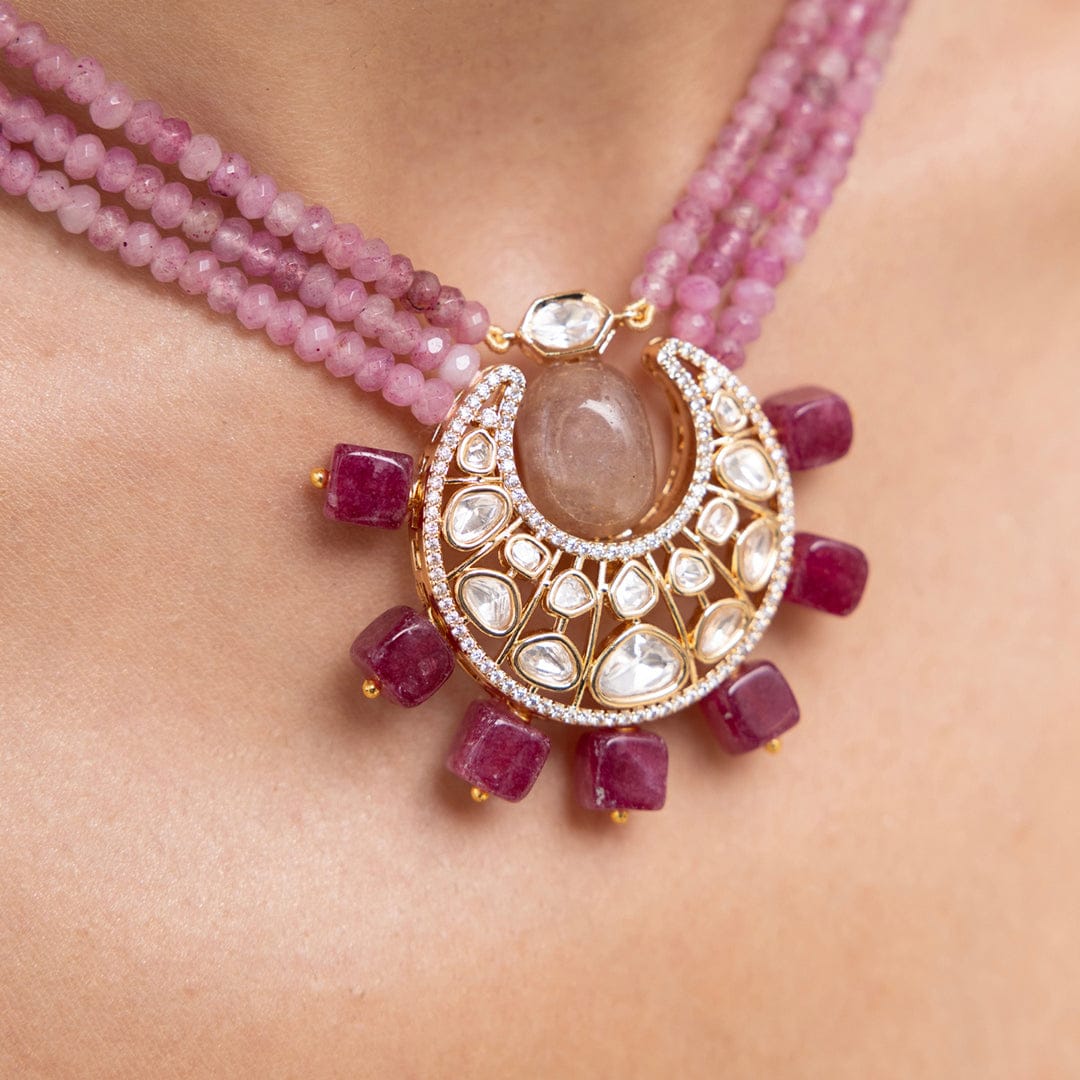 Description: A delicate pink beaded choker crowned with a crescent kundan pendant and wine-hued bead hangings. It radiates youthful elegance with a hint of vintage charm. Perfect for mehendi gatherings, garden soirƩes, or pastel-themed events.