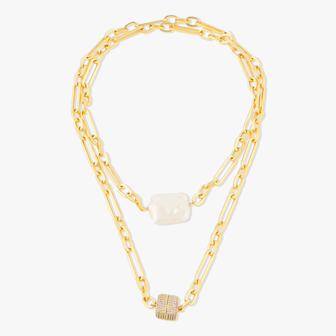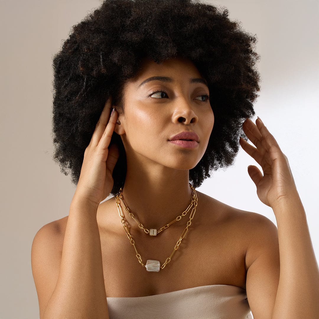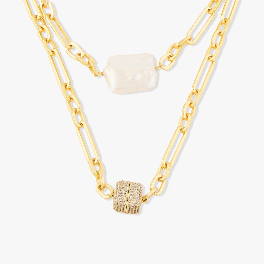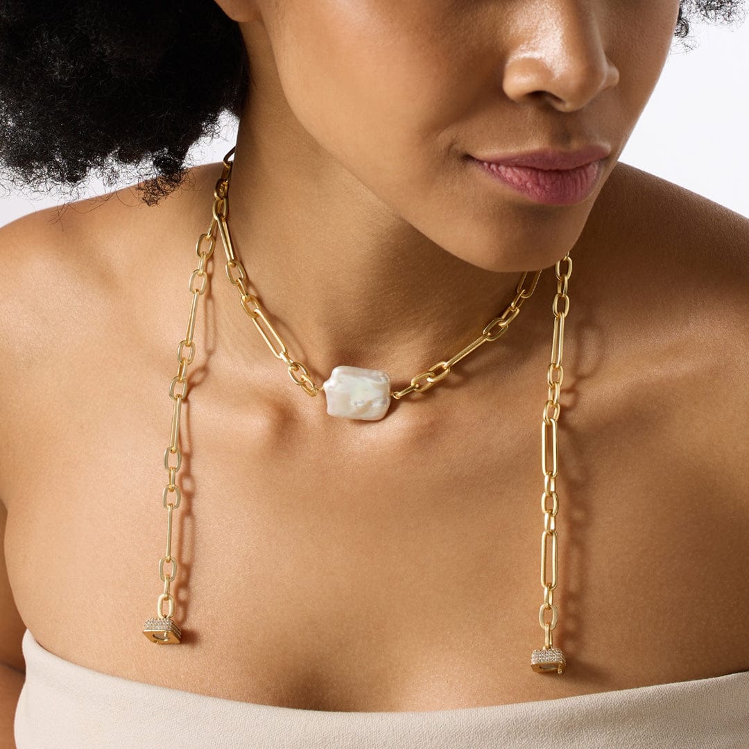 Description: The Uzara Necklace carries the quiet strength of elemental beauty. It features lustrous baroque pearls set between smooth gold-toned connectors, creating a necklace that feels grounded yet fluid. Finished with a magnetic clasp, it layers easily from day to evening. Every pearl holds its own shape and glow, allowing the necklace to tell a story of quiet rarity.