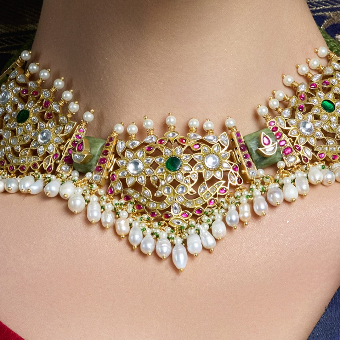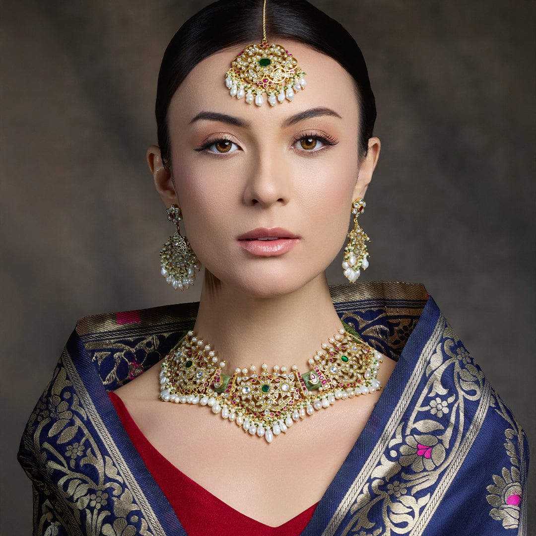 We use 22K Micron Gold Plating on brass, paired with high quality pearls, precious carved beads, semi precious stones, intricately hand painted with enamel, exquisite high quality pearls and high quality kundan that are celebrated for their durability and refinement - making every Joules by Radhika creation a piece that radiates brilliance and sophistication.