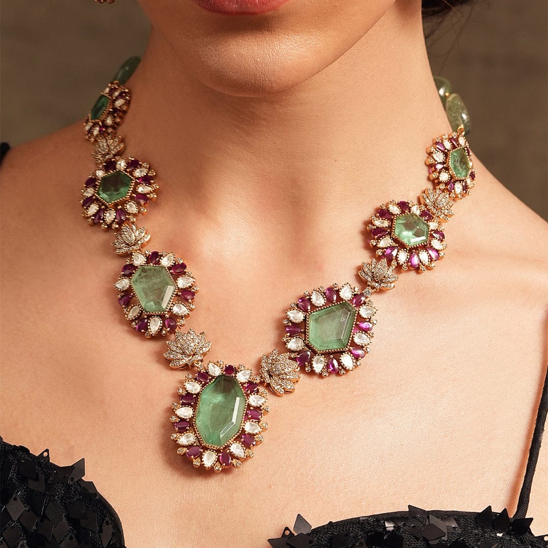 Description: An antique-inspired gleaming necklace set featuring green and pink stones, designed in the elegant Victorian style. The intricate detailing and rich colors make it a timeless statement piece for formal and festive occasions.