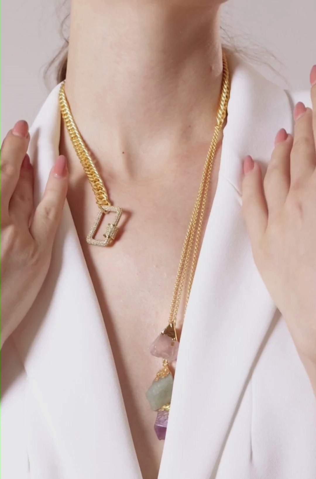 Description: The Zarephia Necklace is inspired by the dance of sunbeams. It features radiant quartz stones in multicolored hues, arranged on a golden chain for a look that feels both lively and refined. Fastened with a toggle clasp, this necklace adds color and clarity to any ensemble. The natural shade and cut of each quartz stone vary, bringing vibrant contrast and character to every piece.